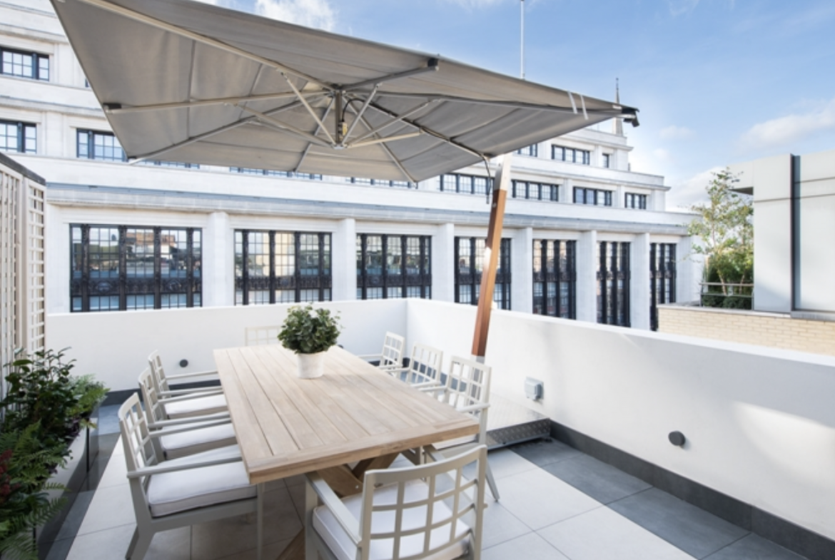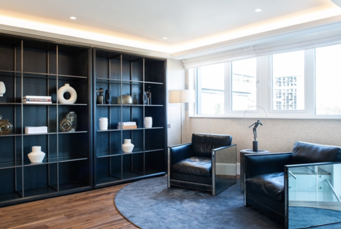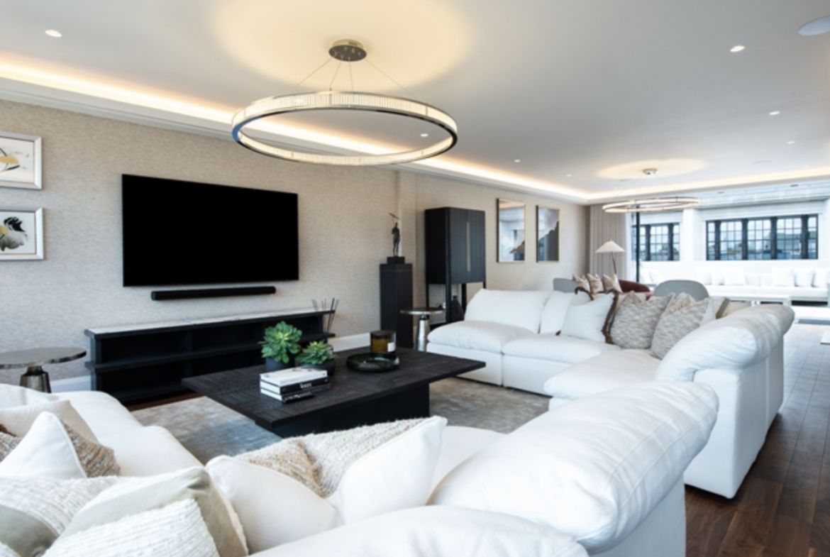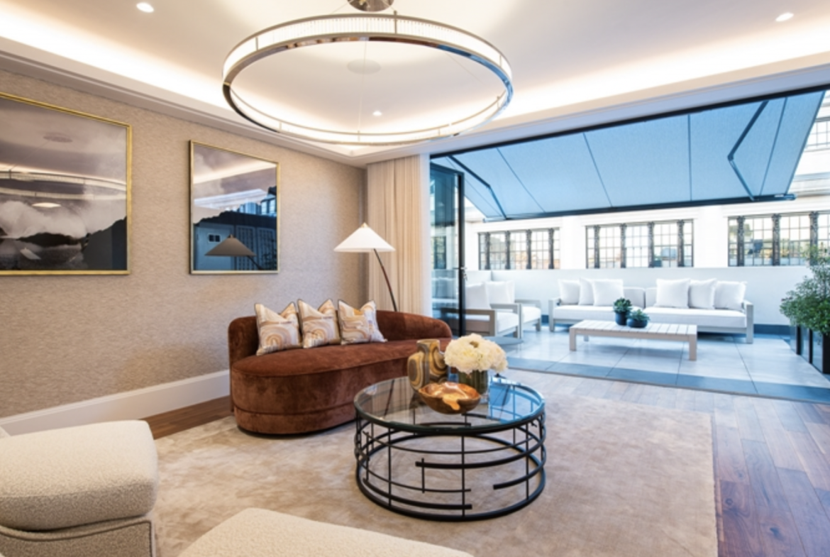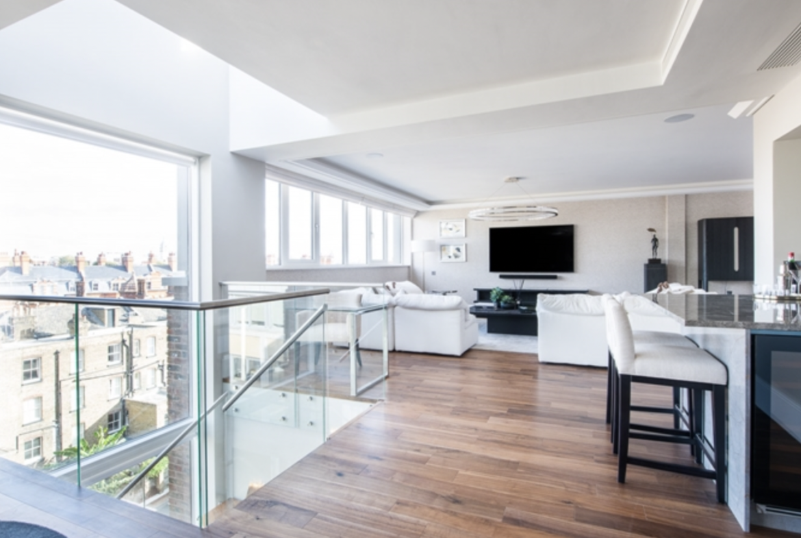 A stunning customized glass staircase offers uninterrupted double height views across London, which in turn leads you up into a unique entertainment and relaxation space offering several lavish areas as well as comfortable dining for 10 people. The open plan feel combines perfectly with two stunning outdoor seating areas that extends seamlessly through from the multiple Bi Folding doors.