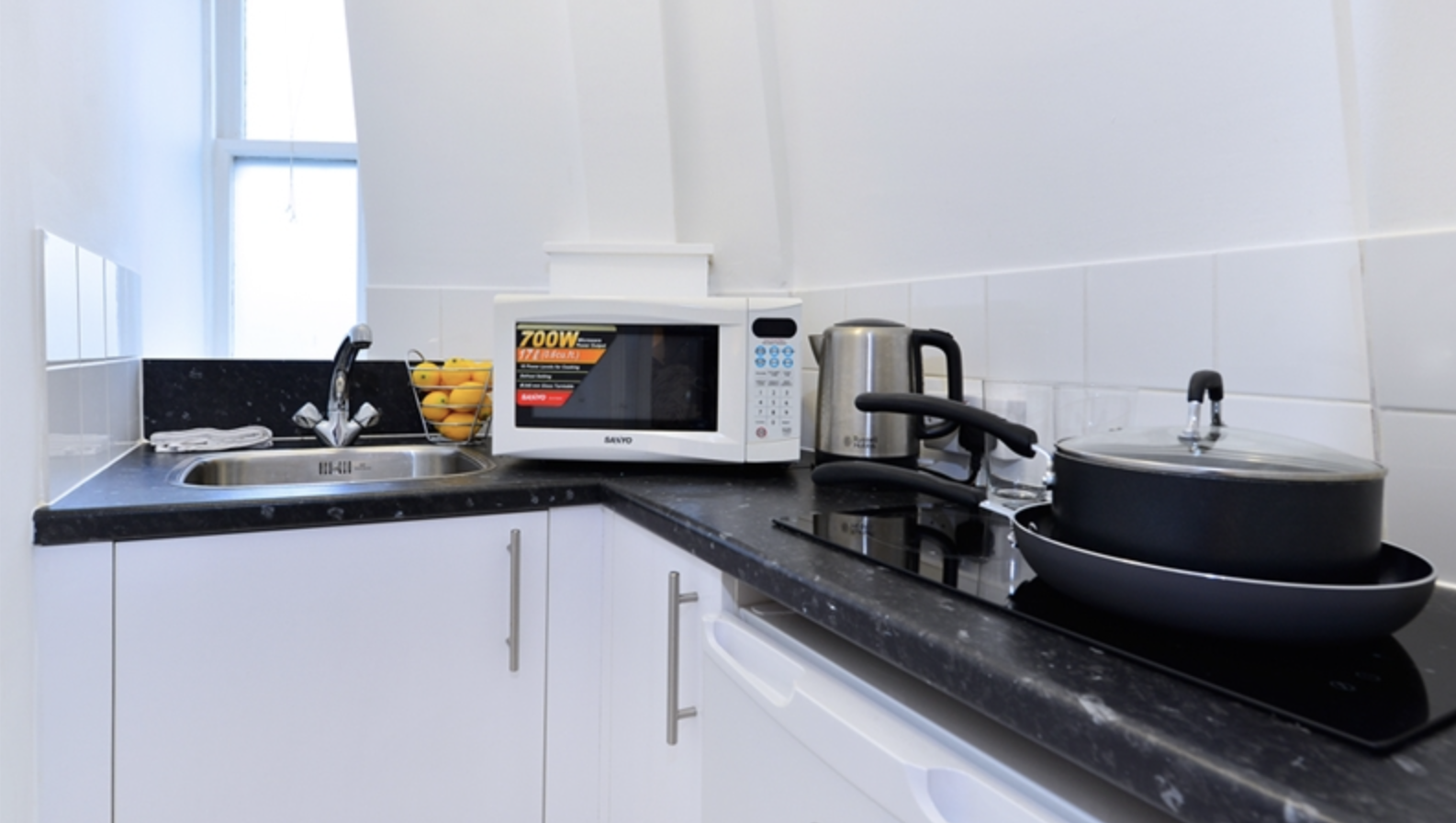 The apartment comprises a large living room area, modern bathroom and a unique kitchenette with access to a private gated communal garden.